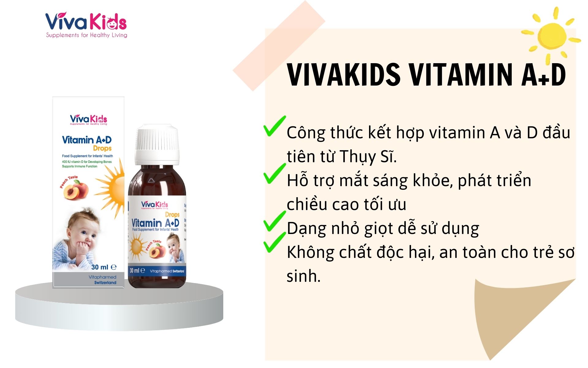 Mẹ nào cũng mong muốn con yêu lớn lên khỏe mạnh, thông minh, có đôi mắt sáng và vóc dáng cao lớn. Để đạt được điều đó, việc bổ sung đầy đủ vitamin, đặc biệt là vitamin A và D, đóng vai trò rất quan trọng. Nhưng không phải mẹ nào cũng biết rõ tầm quan trọng của hai loại vitamin này đối với trẻ sơ sinh và trẻ nhỏ, cũng như cách bổ sung đúng cách. Trong bài viết này, chúng ta sẽ cùng tìm hiểu vai trò của vitamin A và D trong việc giúp bé có “mắt sáng dáng cao” và giới thiệu sản phẩm VivaKids Vitamin A+D – giải pháp an toàn, hiệu quả cho bé yêu.